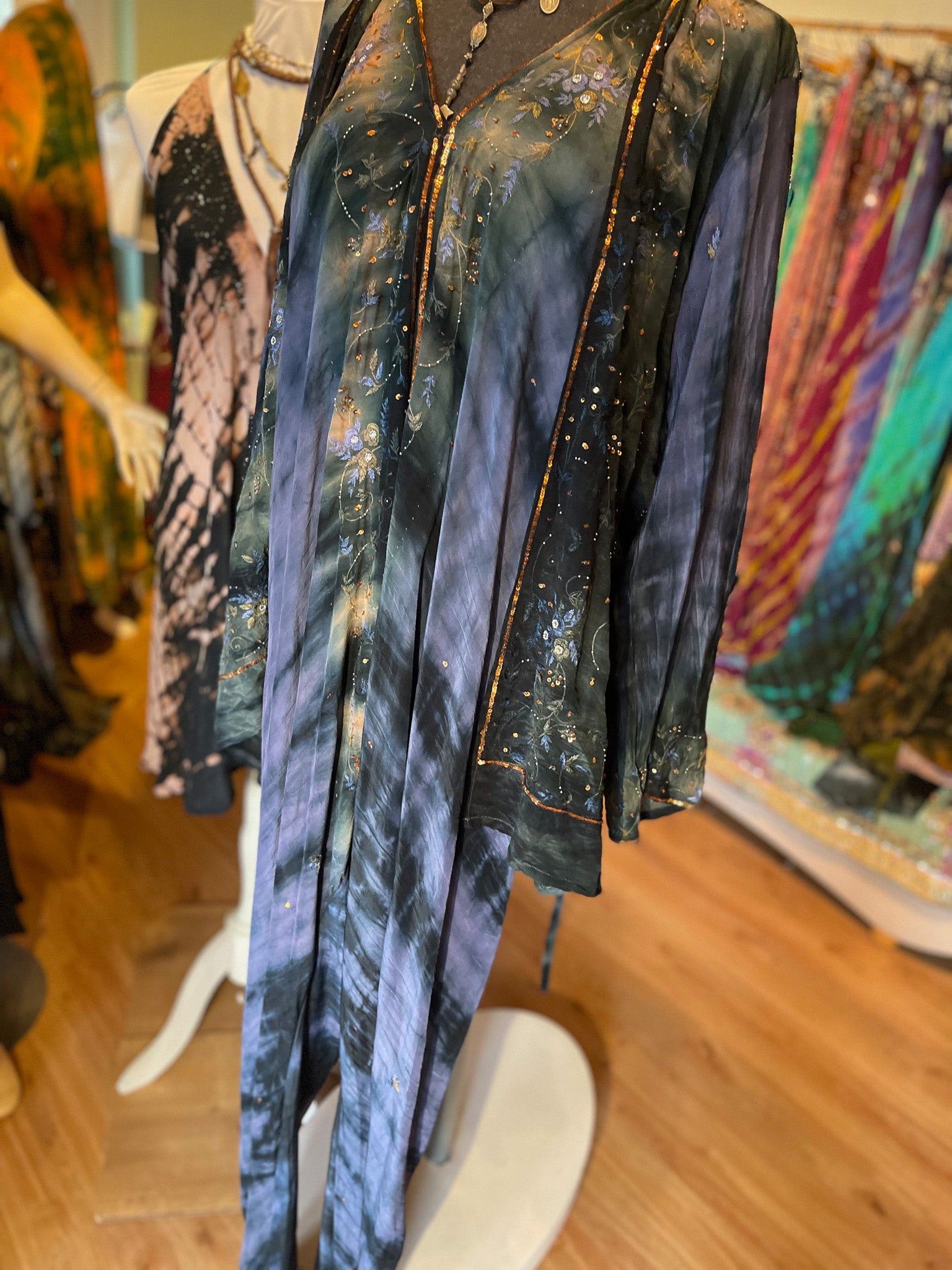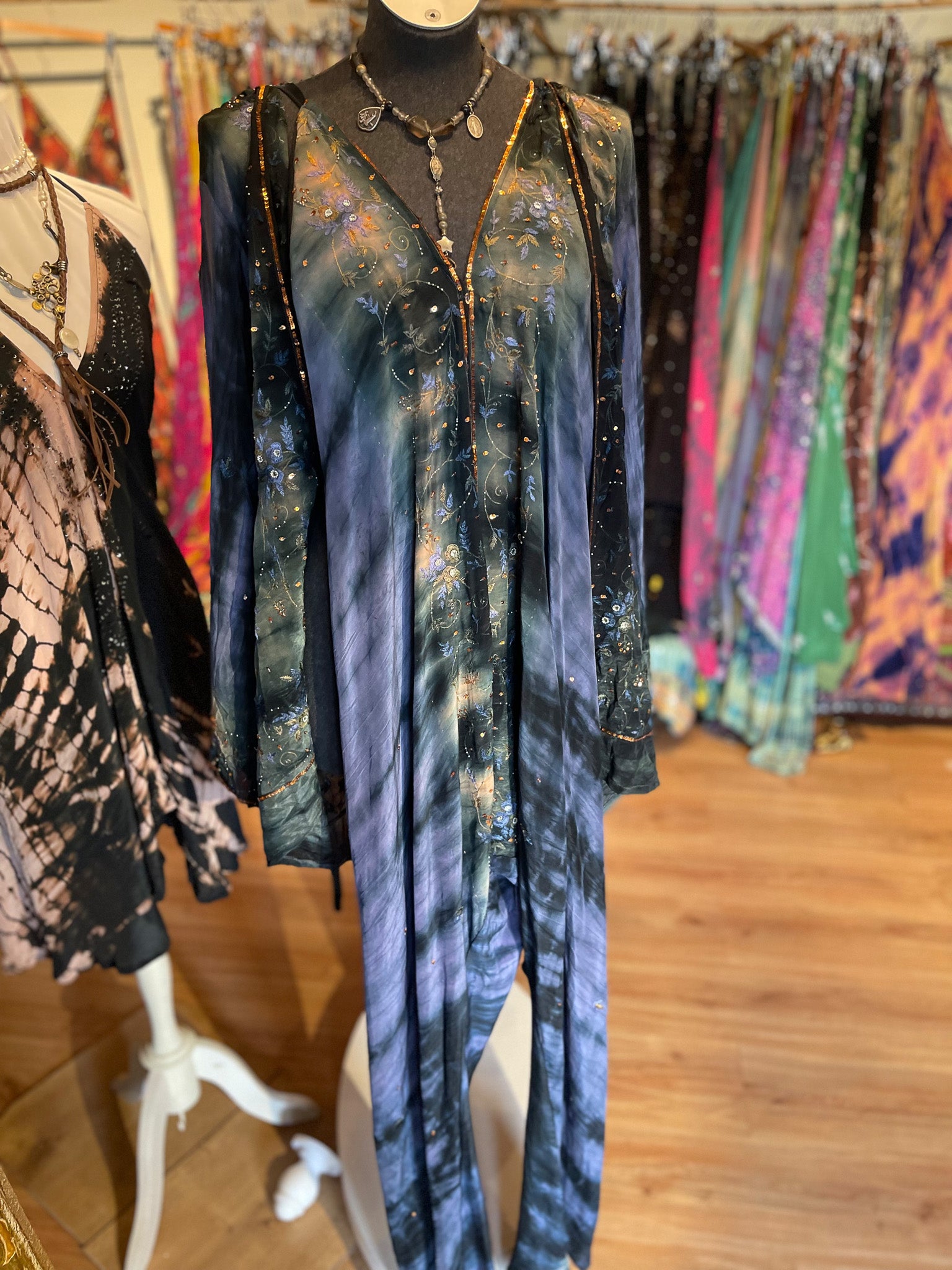 Material: Seide, Model ist 1,75m groß und barfuß.